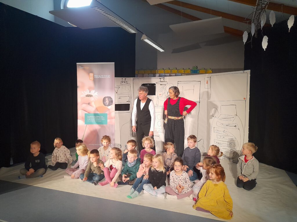 Mit Musik und witzigen Szenen zeigte das Theaterteam, wo Strom gebraucht wird, wo Energie verschwendet wird und was jeder Einzelne tun kann, um Energie zu sparen. Besonders toll: Die Kinder durften immer wieder mitmachen!