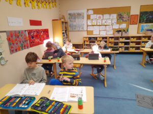 Die Erstklässler widmeten sich an ihren Methodentagen dem Thema „Wochenplan“. Dabei wurden grundlegende Arbeitstechniken wie Schneiden, Kleben, Schreiben, Lochen und Beschriften eingeübt und gefestigt. So machten die Kinder erste Erfahrungen im eigenständigen Arbeiten!