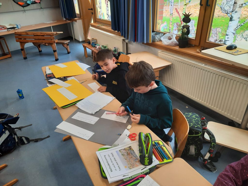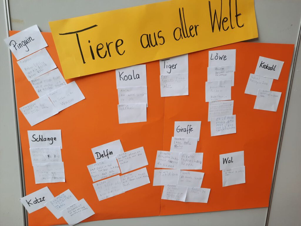In Klasse 2 drehte sich alles um das Thema „Tiere aus aller Welt“. Die Kinder bereiteten in Gruppen einen kleinen Vortrag über ein Tier vor und gestalteten dazu passende Mindmaps, Stichwortzettel und Lernplakate. Am Ende präsentierten die Schülerinnen und Schüler stolz ihre Ergebnisse vor der Klasse. Gemeinsam wurde außerdem ein Tipp-Plakat zum Halten von Vorträgen erstellt, das auch in Zukunft immer wieder genutzt werden kann.