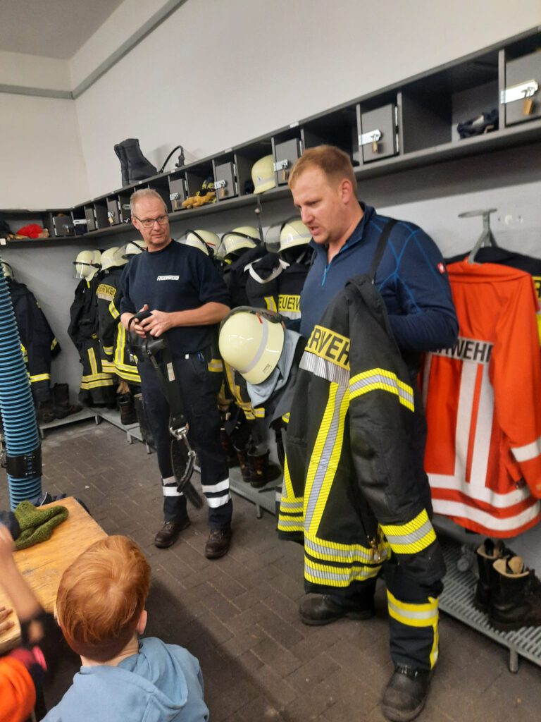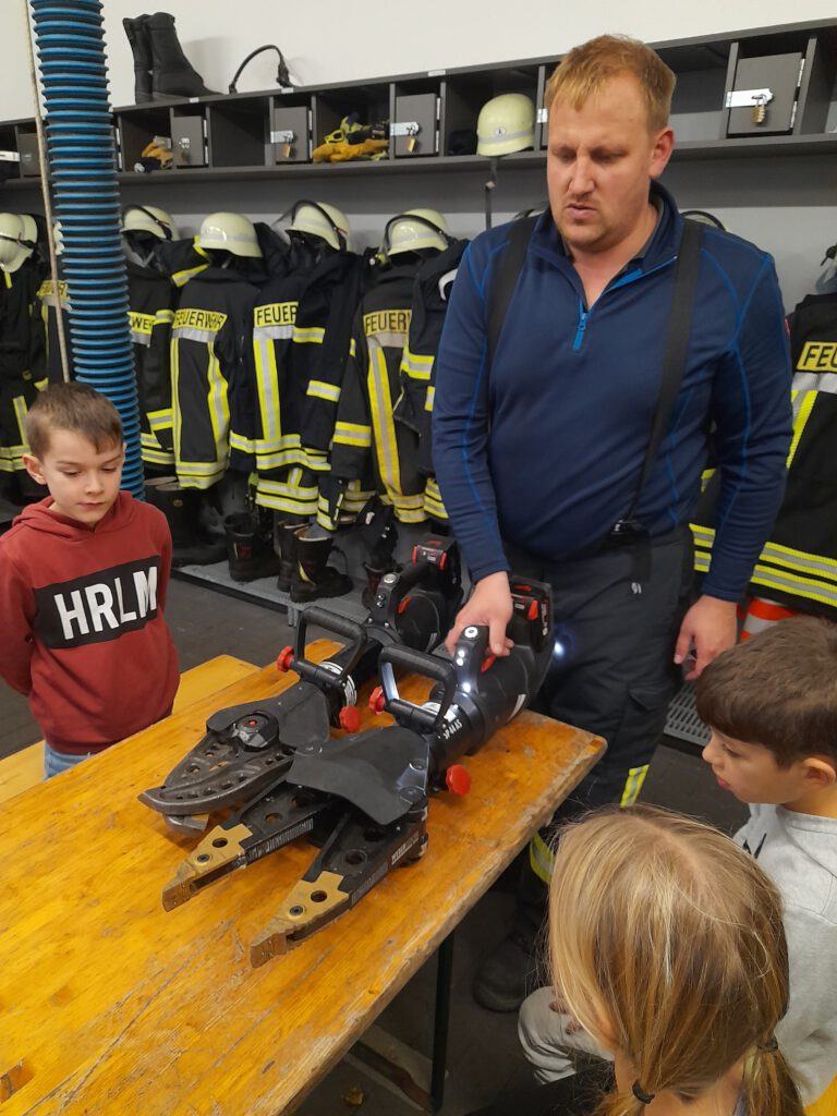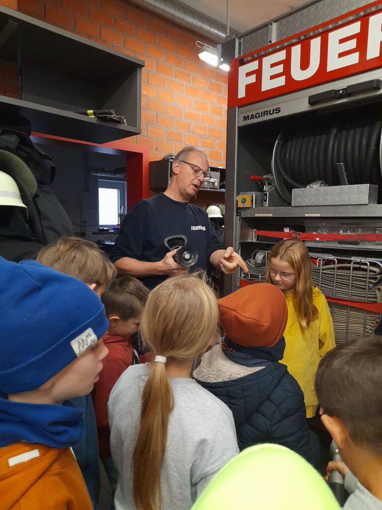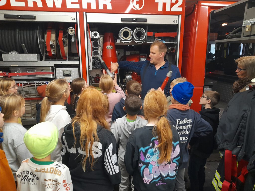 Nach der herzlichen Begrüßung erklärten die Feuerwehrmänner Thomas Penniggers und Thomas Kuhl zunächst die wichtigsten Aufgaben der Feuerwehr. Die Schülerinnen und Schüler erfuhren, wie vielfältig die Einsätze sind – von der Brandbekämpfung über technische Hilfeleistungen bis hin zum Retten von Menschen und Tieren. Besonders aufmerksam hörten die Kinder zu, als es um das richtige Verhalten im Notfall und den Notruf 112 ging.