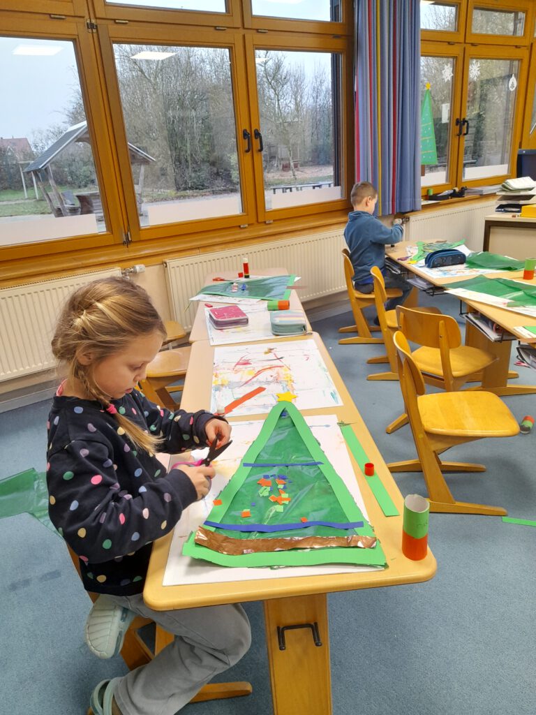 Mit großer Konzentration wurde gefaltet, geschnitten, geklebt und verziert. Besonders schön war zu sehen, wie die Kinder sich gegenseitig unterstützten und stolz ihre Ergebnisse präsentierten. Schritt für Schritt füllten sich die Fenster der Schule mit farbenfrohen weihnachtlichen Motiven.