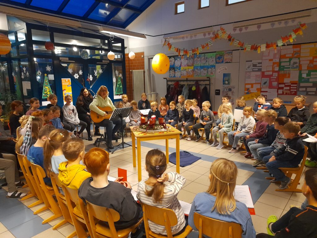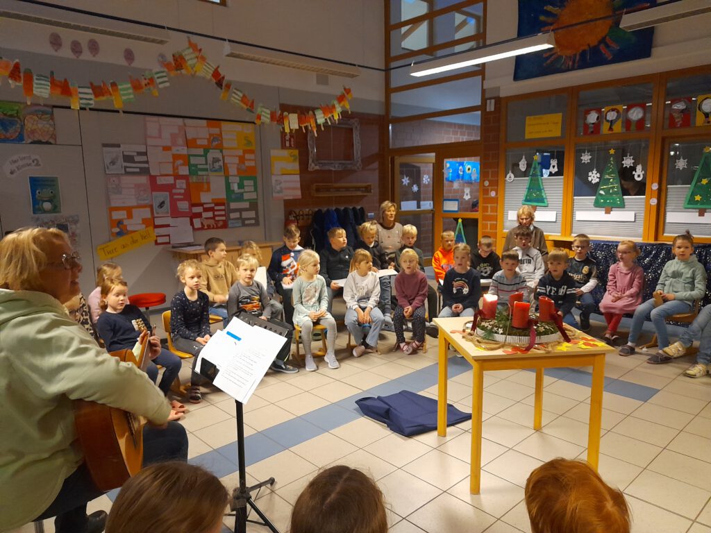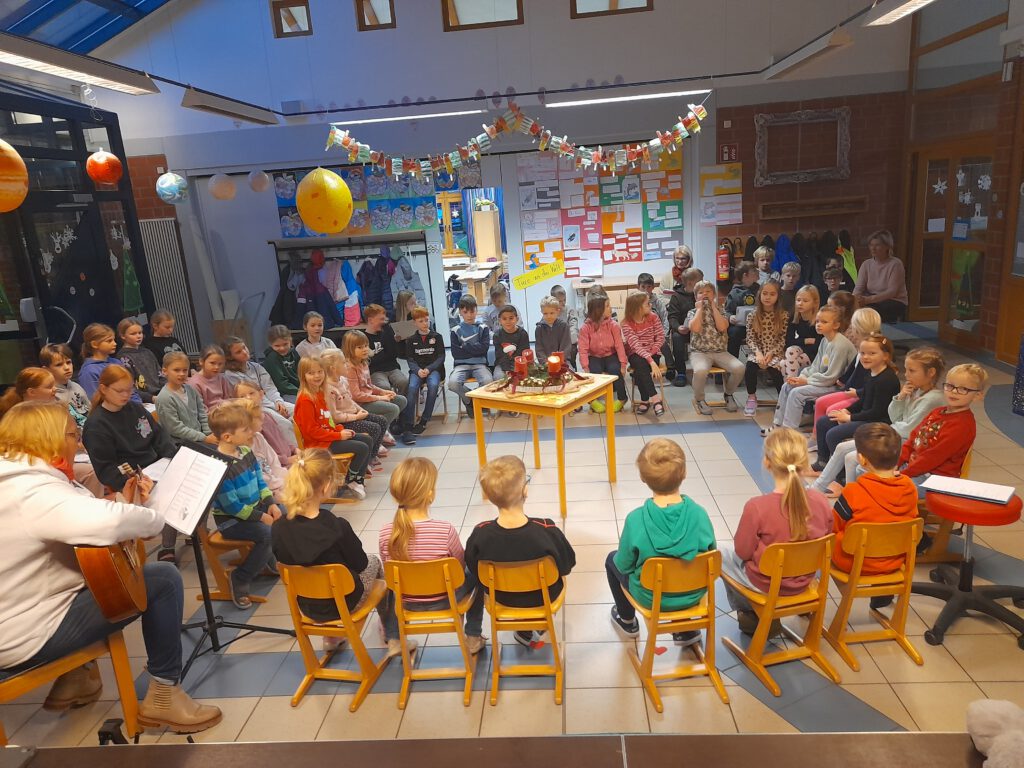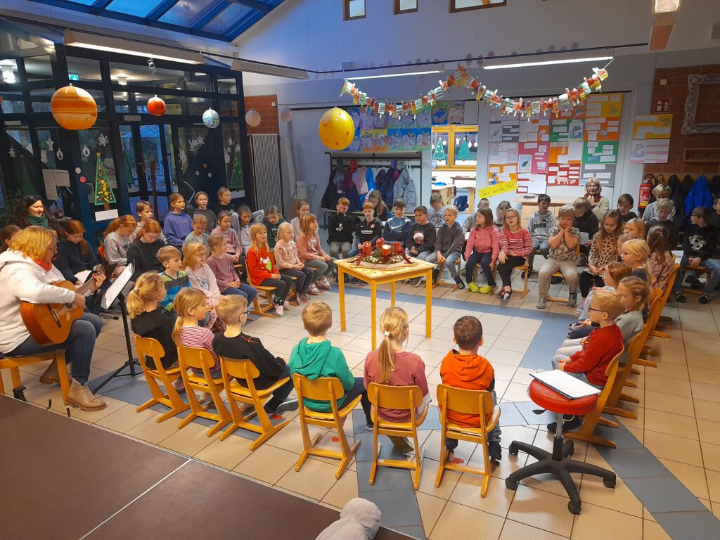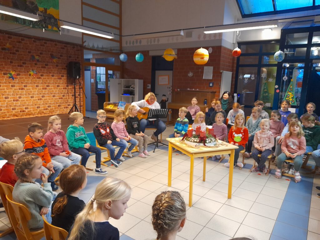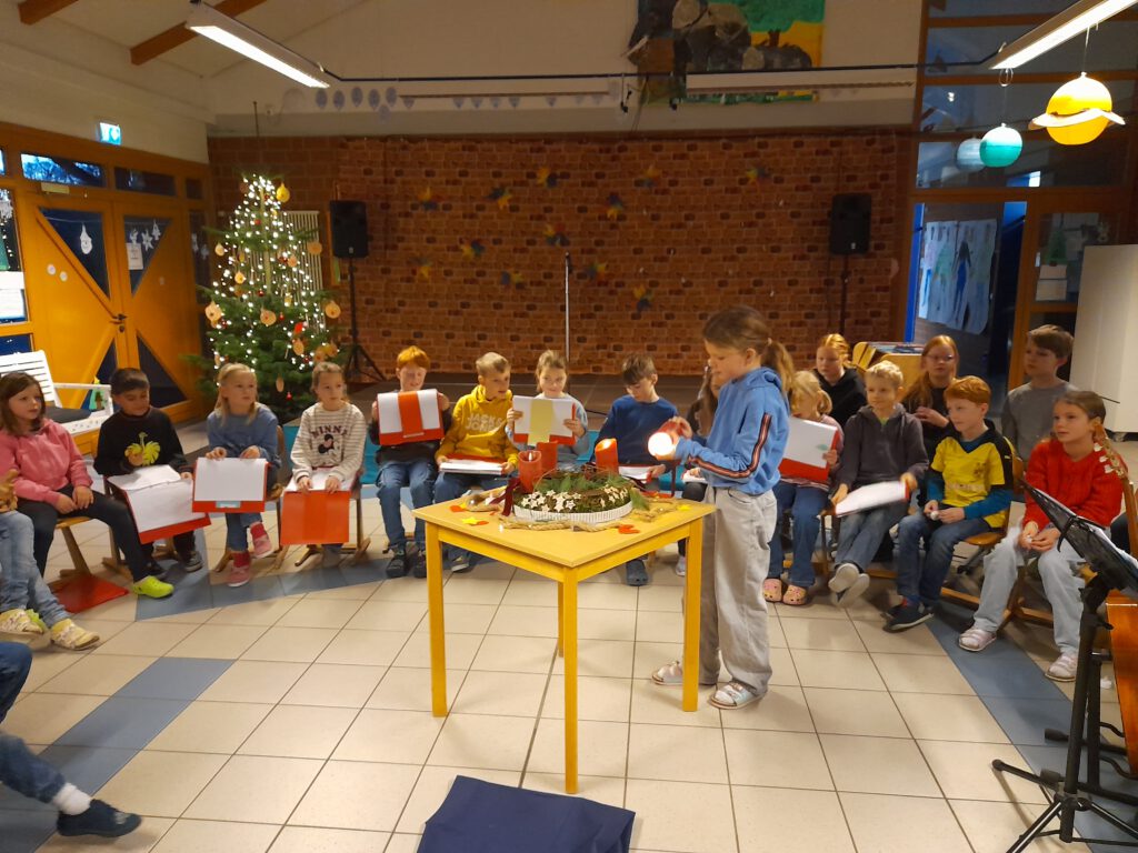 Der Advent ist eine ganz besondere Zeit für alle Kinder und Lehrkräfte. Am 2.12.2024 wurde die Adventszeit in der Aula mit einer feierlichen Adventsbesinnung eingeläutet. Zuerst sangen wir die 1. Strophe von „Wir sagen euch an“, dann lauschten wir Frau Drögemöller mit der Klasse 1, die uns die Nikolausgeschichte erzählte.