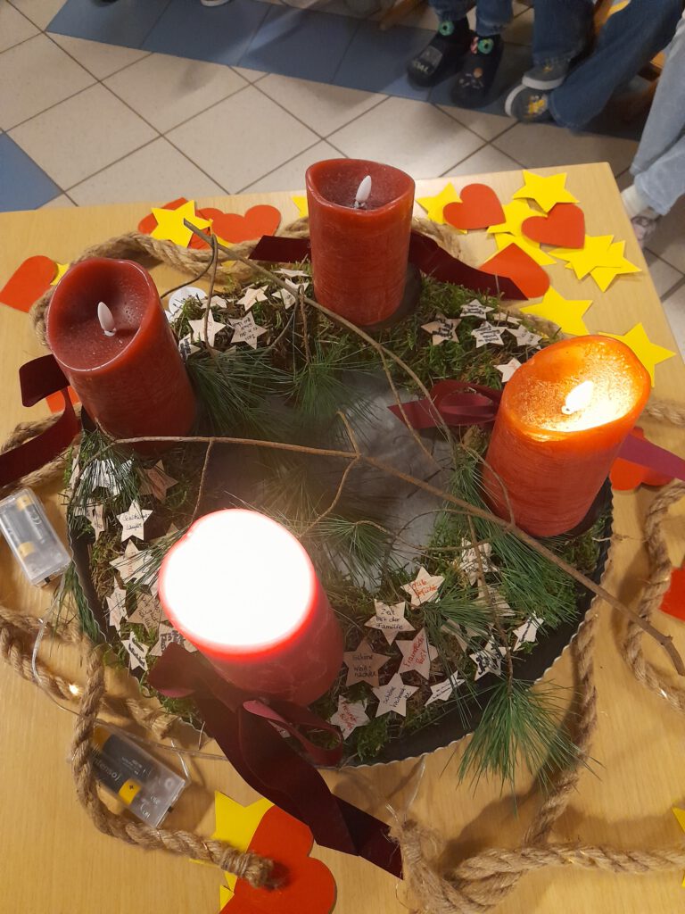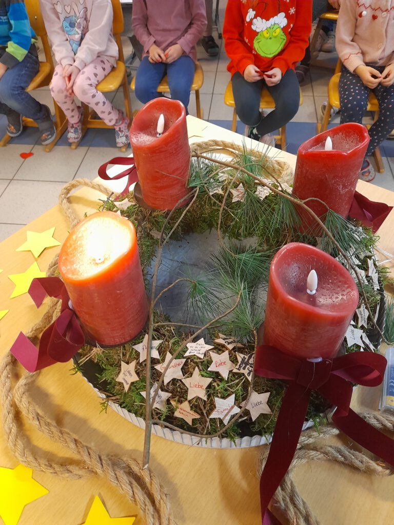 Jeden Montag treffen sich die Klassen zu einer kurzen gemeinsamen Adventsbesinnung, um diese besinnliche Zeit mit der Schulfamilie zu verbringen. Dabei zünden wir die nächste Kerze an und singen zusammen unser Adventslied.