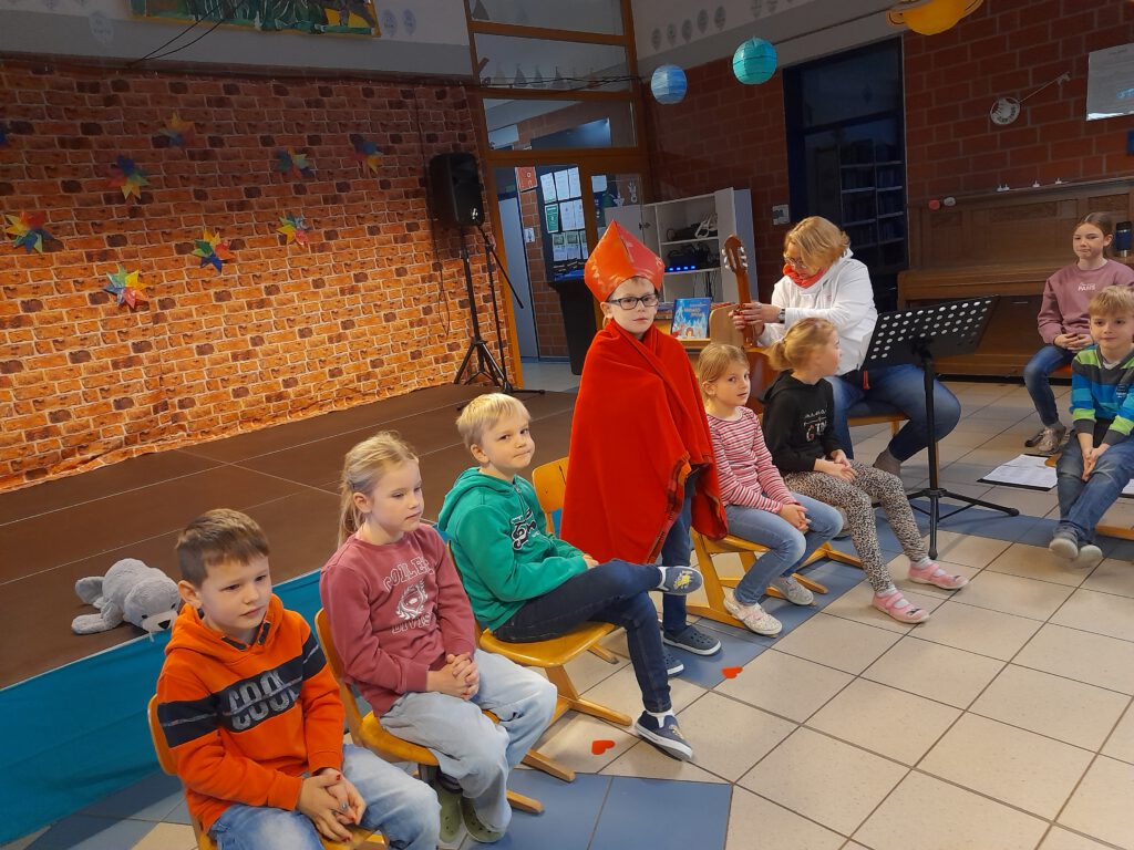 Im zweiten Teil der Besinnung stand der Heilige Nikolaus im Mittelpunkt. Die Schülerinnen und Schüler der Klasse 1 berichteten von seinem Leben und seinen guten Taten: Nikolaus ist ein Vorbild dafür, wie wichtig Teilen, Helfen und Freundlichkeit sind.