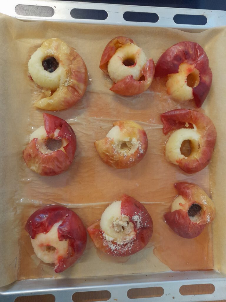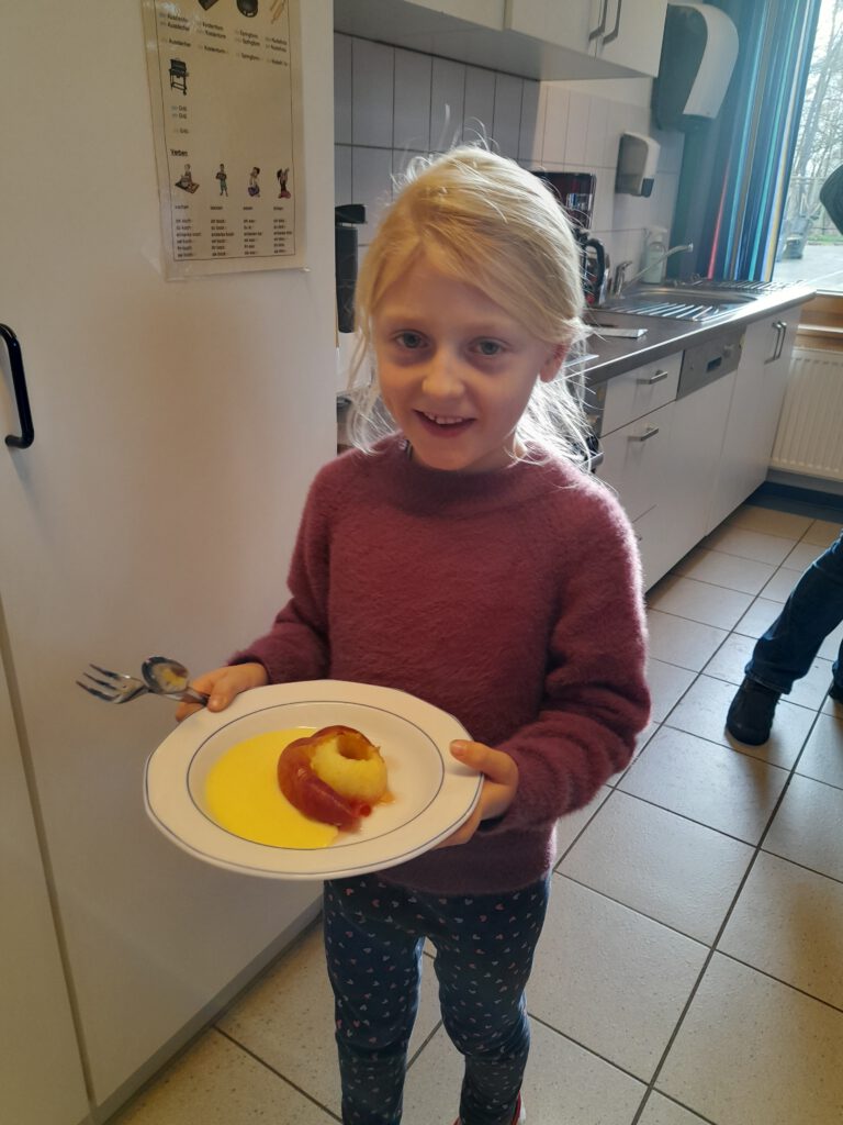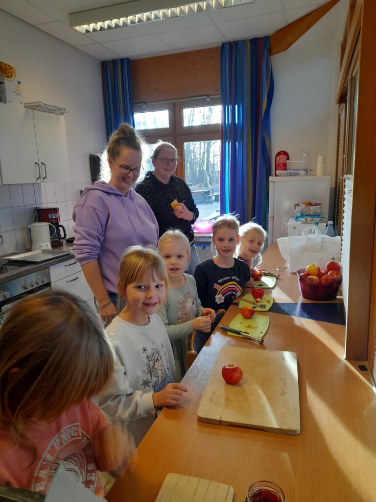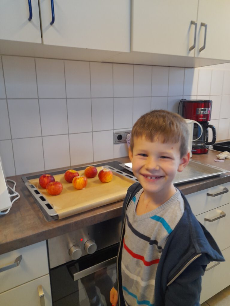 Gemeinsam wählten die Kinder schöne rote Äpfel aus, entfernten das Kerngehäuse und füllten die duftenden Früchte mit Marmelade, Mandeln, Rosinen und etwas Zucker. Mit großer Begeisterung halfen alle beim Vorbereiten und Befüllen der Äpfel.